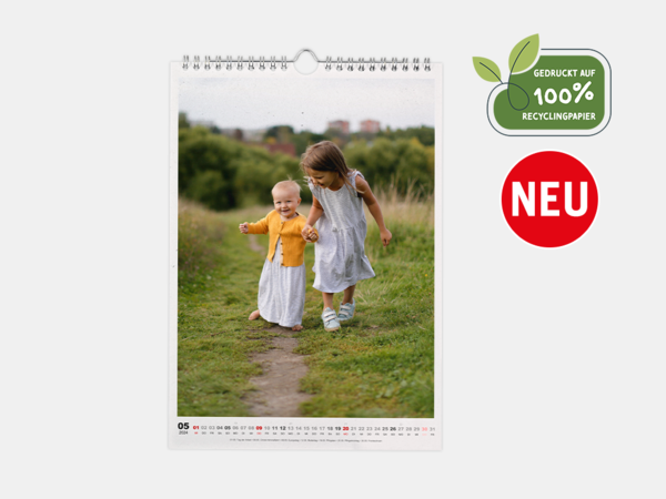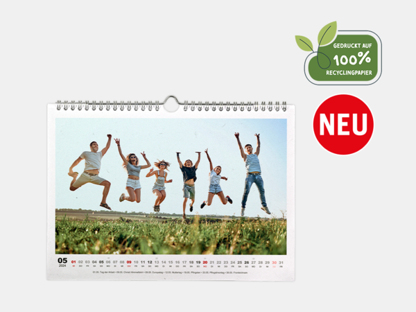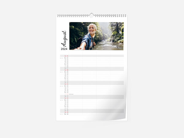 Um eine hohe Stabilität zu gewährleisten, verwenden wir eine zuverlässige Spiralbindung für Ihren Kalender. Dadurch können Sie mühelos von Monat zu Monat das Kalenderblatt wechseln und alle Blätter bleiben dauerhaft zusammen. Die Spiralbindung beinhaltet zudem eine praktische Aufhängung, um den Kalender problemlos an Ihren Wänden anzubringen. Sie ist sowohl bei unseren Echtfoto- als auch bei unseren Digitaldruckkalendern ein fester Bestandteil.
