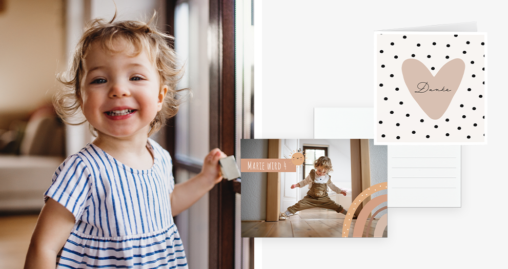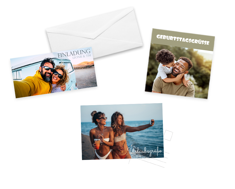 Versenden Sie individuelle Grüße zu jedem Anlass, in brillanten Farben mit Ihrem Wunschmotiv auf echtem Fotopapier.